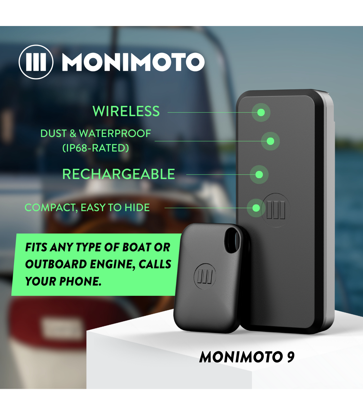 Pristatome naujos kartos Monimoto 9. Išmanusis GPS sekiklis laivams. Mažas, lengvai montuojamas ir įkraunamas. „Monimoto 9“ naudoja LTE-M (LTE Cat-M1) tinklą ir veikia tarptautiniu mastu. „Monimoto“ yra su įdėta „eSIM“ kortele su 2 mėn. NEMOKAMA SIM kortele.